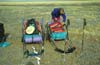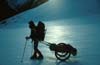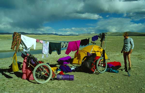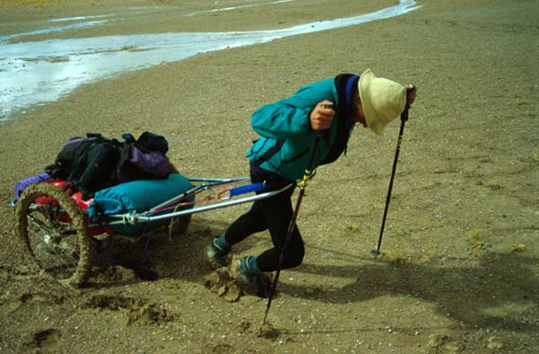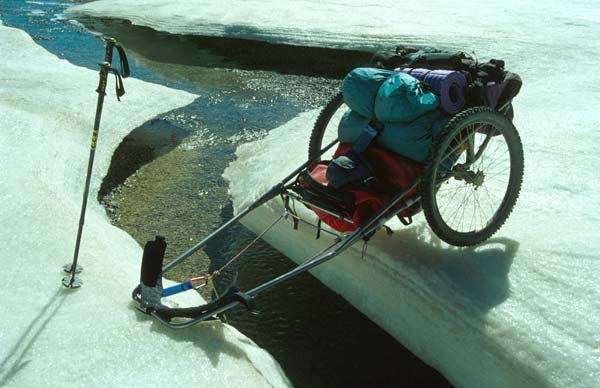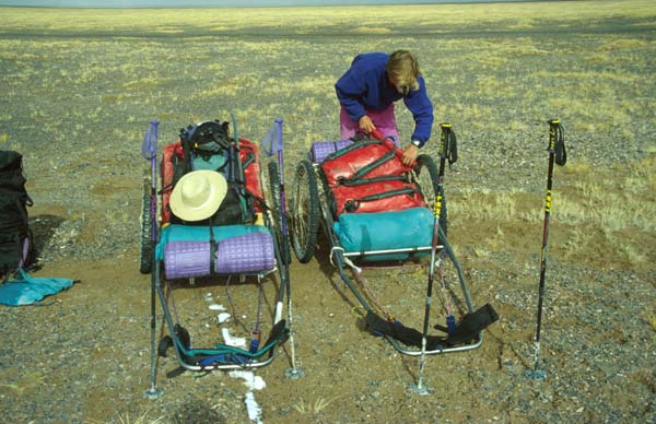 | Die Ausrüstung und die 45 kg Proviant transportierten wir in geländegängigen Anhängern, die ein wenig wie ein Sulky aussehen. Die Anhänger wurden von uns in zweijähriger Entwicklungsarbeit selbst entworfen. Sie bestehen aus einem Rahmen aus Titanrohren und haben eine Holzplatte als Auflagefläche für das Gepäck. Die Anhänger wurden mit Hilfe von Pulka-Zuggeschirren gezogen. | ||||