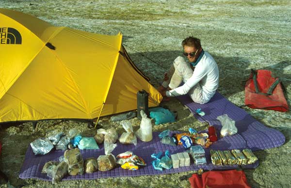 | Um die Strecke von 1000 km durch unbekanntes, unwegsames Gelände zu bewältigen veranschlagten wir eine Tagesleistung von 20 km pro Tag und planten etwa 1kg Provinat mit 4500 kcal pro Tag und Person ein. Dazu 20 Liter Wasser - in dieser Höhe brauchen wir täglich mindestens fünf Liter - und 25 Kilogramm Kleidung, Bergausrüstung, Schlafsäcke und Zelt. Völlig undenkbar, all dies auf dem Rücken zu schleppen... | ||||